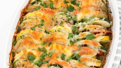 يغطى الطبق بورق الالمنيوم وتخبز في فرن محمى لمدة 30 دقيقة. يرفع ورق الالمنيوم، وترش بالجبن المبشور وتخبز من 15 إلى 20 دقيقة أو حتى يصبح الجبن ذهبي اللون. يزين بالبقدونس المفروم، إذا رغبت في ذلك.