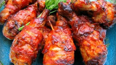 تقدم قطع الدجاج المحمرة مع الأرز أو السلطة حسب الرغبة.