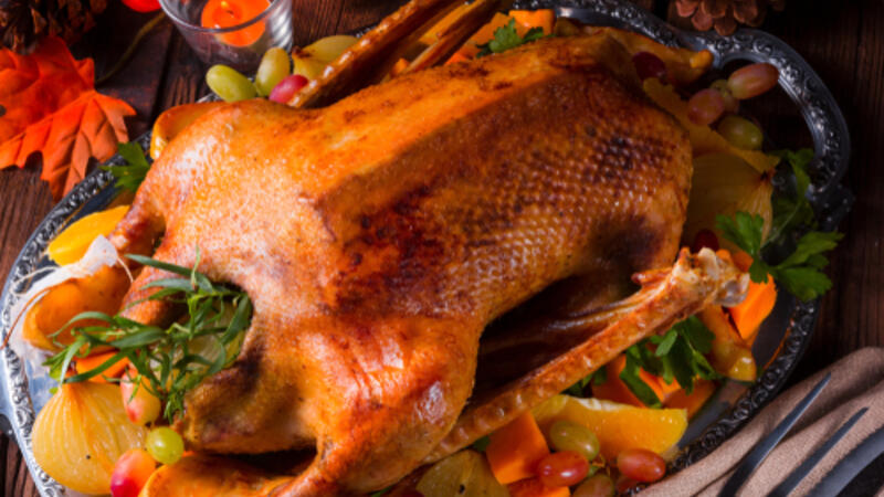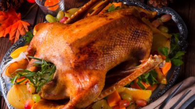 - ثم ادهن الديك الرومي بالسوائل التي تنزل منه من حين لآخر، حيث تفرز عصارته بعد ساعتين من بدء الطهي.