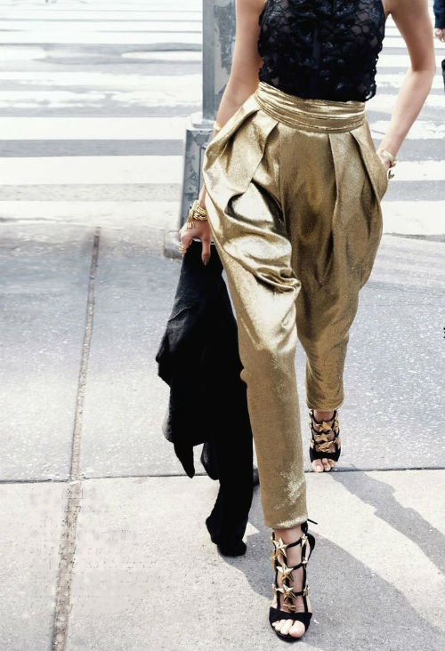 • نسّقي السروال الذهبي اللامع الواسع، مع كنزة عالية الرقبة وبلايزر سوداء كلاسيكي.