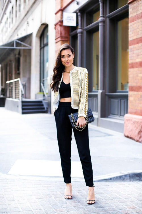 • نسقي السروال القماشي الأسود الواسع، مع سترة رياضية ذهبية أنيقة.