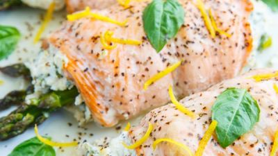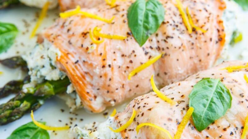 تعلمي صنع لفائف سمك السلمون المحشوة بجبن الريكوتا والريحان والهليون مع صلصة الليمون الطازجة واللذيذة!
