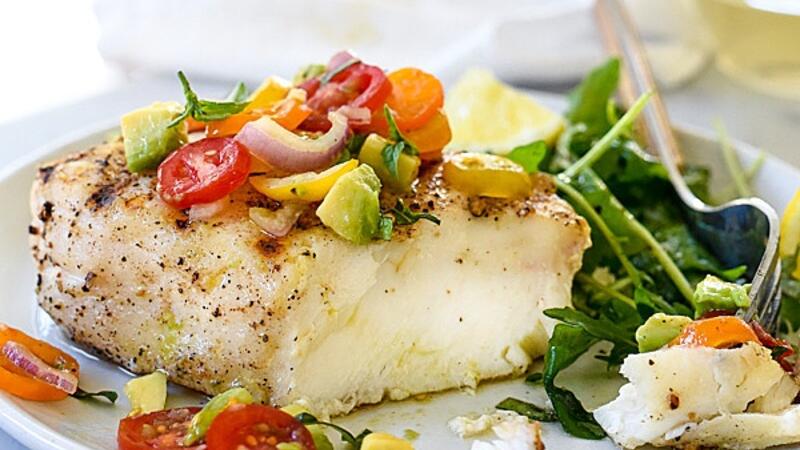 الهلبوت المشوي مع صلصة الطماطم الأفوكادو