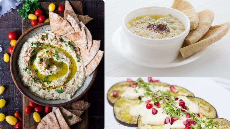 بابا غنوج من المقبلات الشرقية الشهيرة يحتوي على الباذنجان وزيت الزيتون والاعشاب الطازجة ويقدم مع الخبز الكامل.