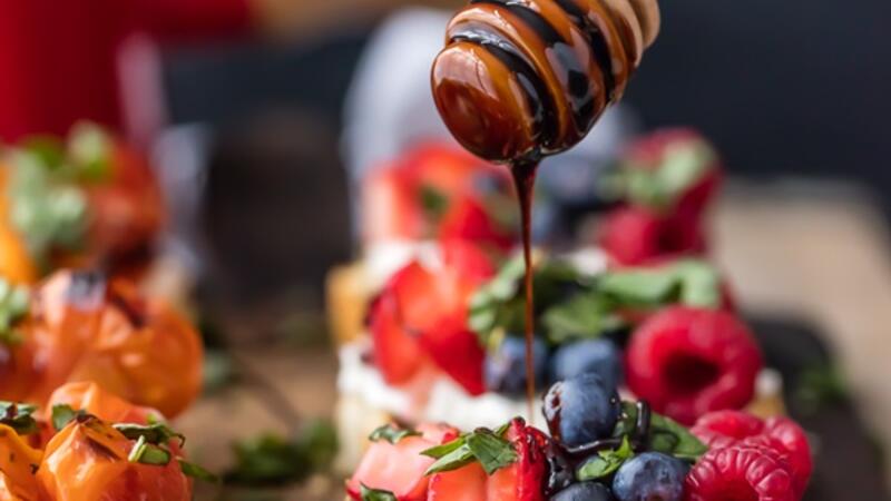 يسخن الخل البلسمي والسكر في قدر صغير ويُغلى المزيج. يُخفّض المزيج على نار خفيفة الحرارة لمدة 6-8 دقائق أو حتى يُخفَّض بمقدار الثلث تقريبًا. انت تريده أن يكون حلوا ولكن ليس كثيفا للغاية.