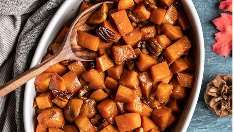 بطاطا حلوة مشوية مع شراب القيقب والبيكان (المعروف أيضًا باسم بطاطا حلوة بالجوز) هي طبق خريفي جانبي سهل وكلاسيكي وغني بالفيتامينات وسيحبه الجميع.