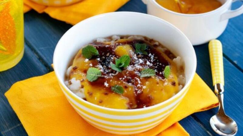 6. في اطباق التقديم، توضع كمية من (بودنغ الارز). ثم توضع كمية من صلصة المانغا والكاراميل. تزين برقائق جوزالهند وأوراق النعناع.