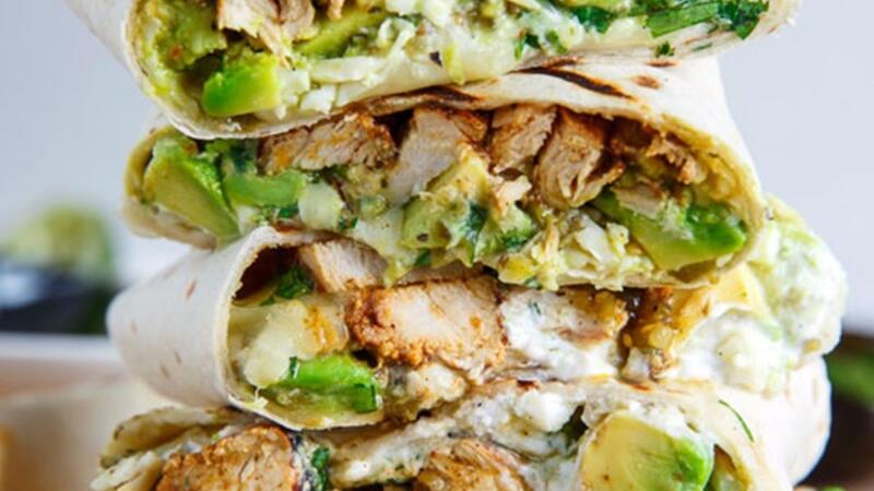 بوريتو محشوة بالدجاج ، والأفوكادو، والجبن، والصلصة الحارة والقشدة الحامضة!