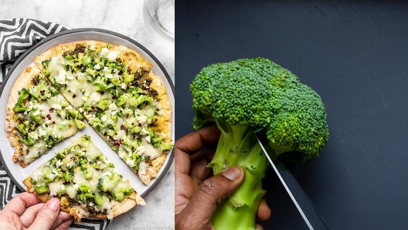 بيتزا البروكلي بيستو هي أسرع وأسهل طريقة للحصول على بيتزا صحية، مع قشرة التورتيلا الرقيقة والمقرمشة.
