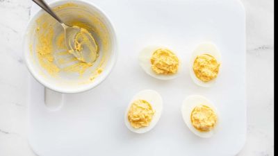 قشر البيض ثم قطعه إلى نصفين. أخرج الصفار من البيض وضعه في وعاء. يُضاف المايونيز وخردل ديجون والملح والتوابل ويُهرس جيدًا.