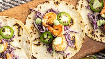 لعمل سندويشات التاكو بالجمبري ، أضف حفنة من الكرنب إلى قاع كل خبز تورتيلا ثم ضع عليها القليل من الروبيان وشريحتين من الهالبينو. اضف القليل من صلصة الأفوكادو المتبقية على الوجه ، ثم استمتع!