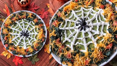 تاكو الهالويين المرعب، صينية من الفاصولياء المكسيكية مع صلصة الافوكادو والكريمة الحامضة..