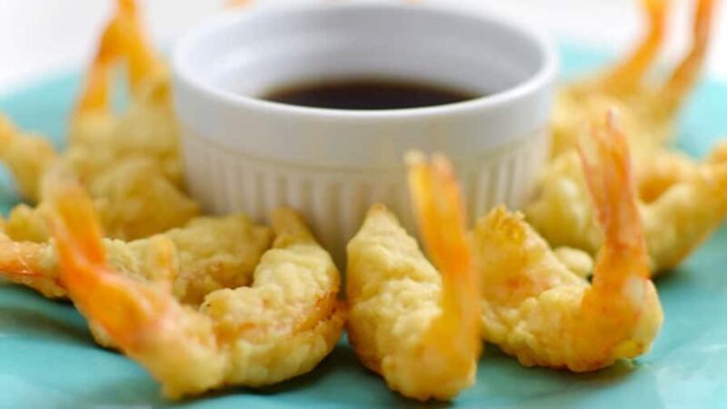 تامبورا الجمبري المغلفة بالعجينة الهشة، تقدم مع صلصة مرق السمك وصلصة الصويا...