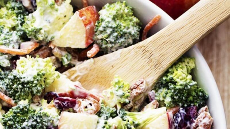 في وعاء كبير تخلط زهرات البروكلي والجزر والبصل الأحمر والتفاح والجوز الأمريكي، والتوت البري المجفف.