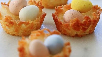 هل تحبين حلوى جوز الهند المعروفة باسم المعكرون، لما لا تحوليها الى أعشاش صغيرة للبيض الملون، وصف لذيذة لعيد الفصح.
