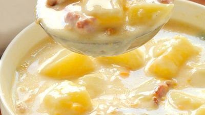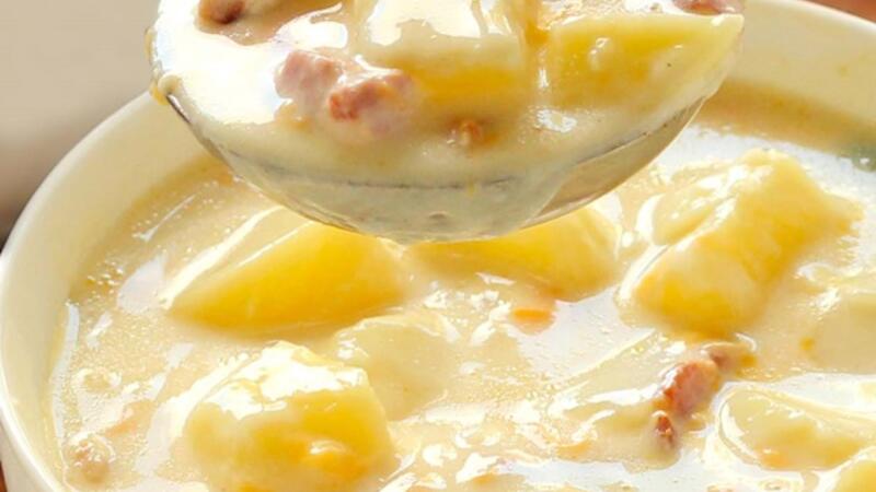 تضاف البطاطا والحليب واللحم المقدد المطبوخ ويترك ليغلي.