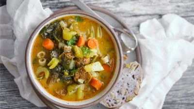 هذه الوجبة الحميمة والمغذّية مليئة بالخضار والمعكرونة والنقانق النباتية. يعد هذا الحساء مثالي في الخريف والشتاء.