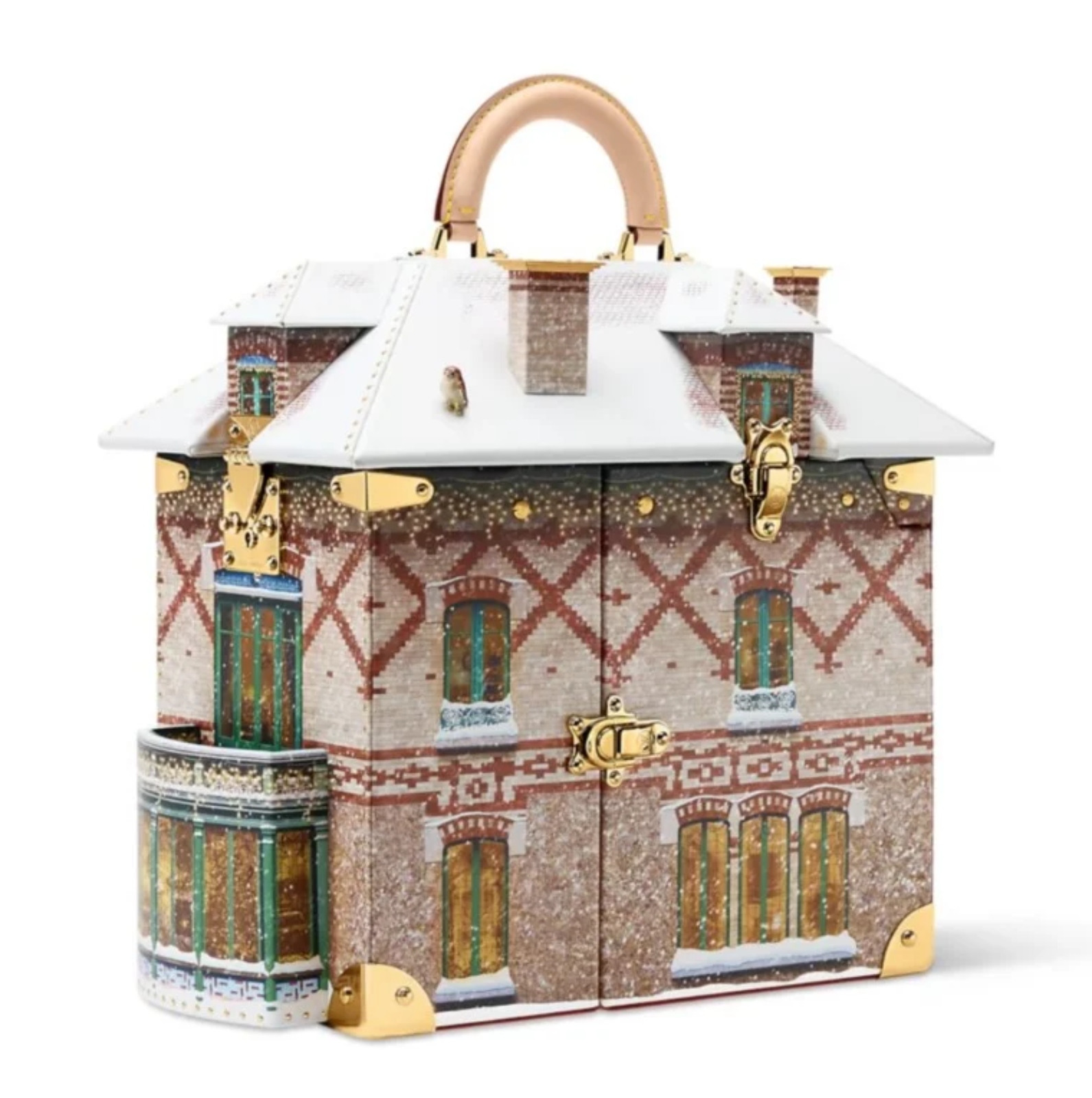تُترجم حقيبة Louis Vuitton الجديدة هذا الإلهام إلى تصميم هندسي دقيق، إذ صُنعت جدرانها من جلد متين يمنحها مظهر الحجر، بينما جاء السقف بألوان دافئة تحاكي لون الطين التقليدي. أما النوافذ، فقد نُفذت بدقة متناهية وأُحيطت بإطارات معدنية ذهبية مستوحاة من الحرفية الفرنسية الكلاسيكية.