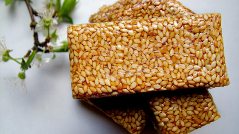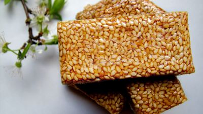في وعاء يخلط السكر والعسل، ثم يوضع على نار متوسطة الحرارة ليذوب ويغلي، ويمزج باستمرار. بمجرد أن تصل إلى مرحلة الفقاعات لمدة 2 دقيقة ترفع عن الحرارة. تضاف بذور السمسم. يُمزج المزيج جيداً ويُسكب على الصينية. هذا هو الجزء الأكثر "صعوبة" الآن بسرعة قبل يصبح الكراميل قاسيا. قم بتغطيته بورقة أخرى وباستخدام الأسطوانة الخشبية ، أو مقلاة عريضة تفرد عجينة السمسم حسب السماكة المطلوبة