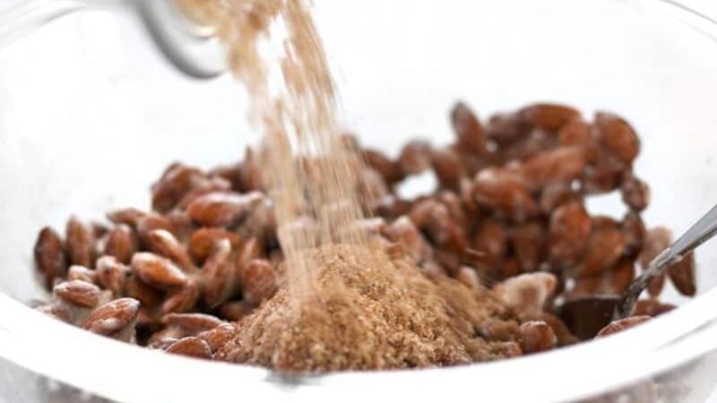 انشر اللوز المغطى بالسكر على ورقة خبز مبطنة بورق زبدة أو رقائق مغطاة برذاذ غير لاصق. اخبزيها لمدة 30 دقيقة مع التحريك مرة واحدة في منتصف الطريق. بعد الخبز ، اترك اللوز يبرد ، وخلال هذه الفترة يتجمد الطلاء ليصبح قشرة حلوى مقرمشة.