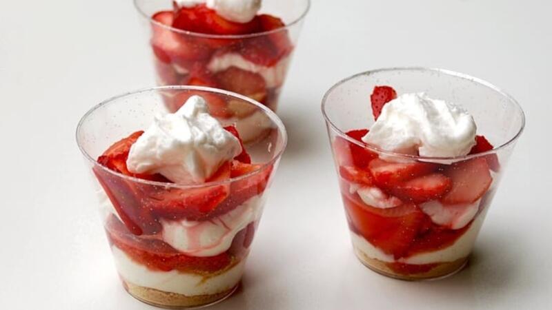 لتحضير الحلو، تقسّم المكونات بين 8 أكواب. أولا يوضع فتات بسكويت غراهام ، الجبنة الكريمية ، والفراولة.