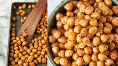 يتبل الحمص بالبهارات. ويقلب. يُقدّم الحمص دافئًا ومقرمشًا.