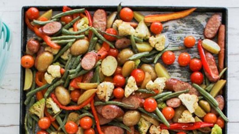 5. تخبز لمدة 20 دقيقة أخرى أو حتى تصبح الخضروات هشة والسجق ناضج.