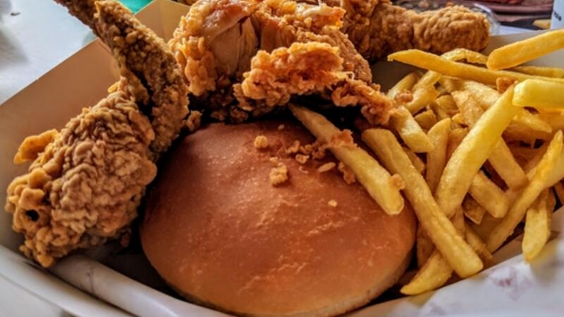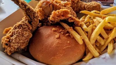 - بعد ذلك نقدّم طبق البروستد المقرمش مع اللبن، والمايونيز، والكاتشب، والسّلطة.