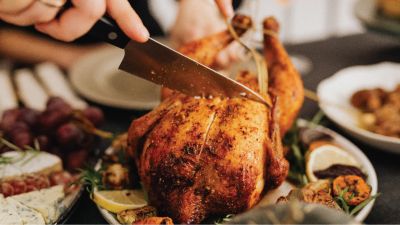 يخبز الدجاج في الفرن المسخن مسبقًا حتى يختفي اللون الوردي من العظم وتصبح العصائر صافية ، حوالي ساعة و 15 دقيقة. يجب أن يقرأ مقياس الحرارة الفوري الذي يتم إدخاله في الجزء السميك من الفخذ ، بالقرب من العظم ، 180 درجة فهرنهايت (82 درجة مئوية). يُرفع عن النار ويُضاف إليه السمن المذاب والمرق. غطي بورق الألمنيوم واتركيه يرتاح لمدة 30 دقيقة قبل التقديم.