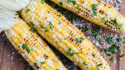 تزال القشور المتبقية وتدهن حبات الذرة مع زبدة الثوم المذابة بينما لا تزال ساخنة. وترش بجبن البارميزان والبقدونس.