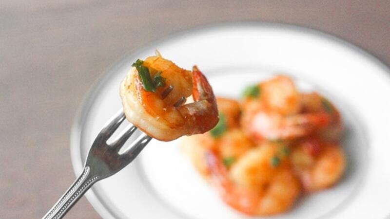تقلى لمدة 3-4 دقيقة على كل جانب. ثم اثناء تقليب القريدس، يضاف الماء.