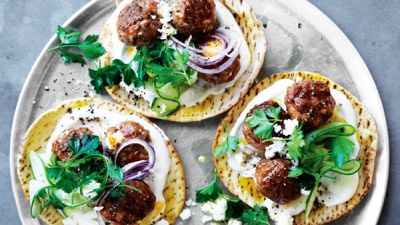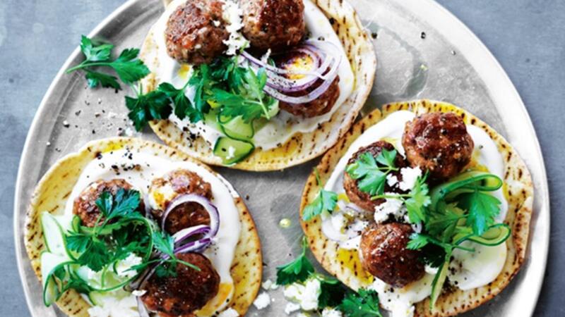 توضع ملعقة من اللبن الزبادي على الخبز وفوقها توضع كرات اللحم والخيار والبصل والبقدونس والباقي الفيتا. يرش بالفلفل الأسود ويقدم.