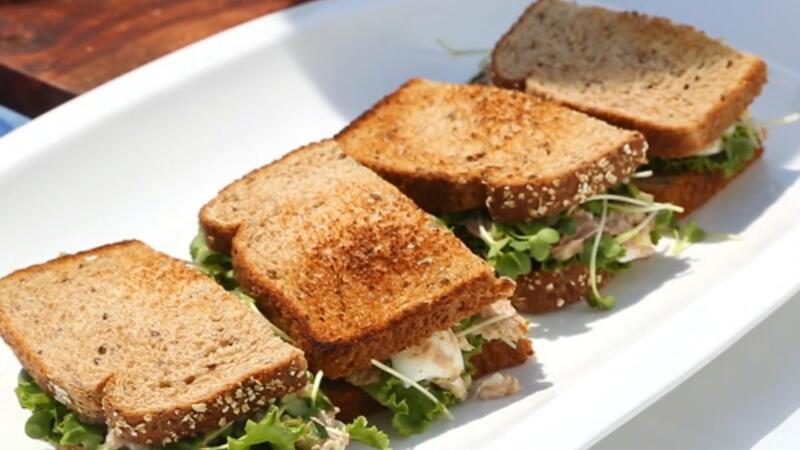 تقطع شرائح التوست الى مربعات متساوية وتحشى بخليط التونا وتزين بشرائح البصل الأخضر.