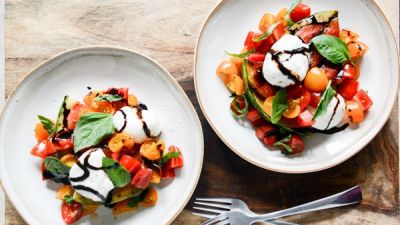توضع مثلثات البطيخ على كل طبق، ثم تضاف قطع الطماطم والموزاريلا وأوراق الريحان. ترش بالملح والفلفل وخل البلسميك ثم تقدم.