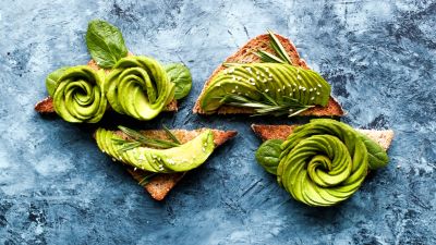 تقسم حبات الأفوكادو إلى قسمين ثم تفرغ بالملعقة في وعاء.
