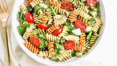 سلطة الباستا الصيفية البسيطة هي طبق جانبي مثالي لجلسات الصيف. تقدم مع الصلصة الإيطالية.