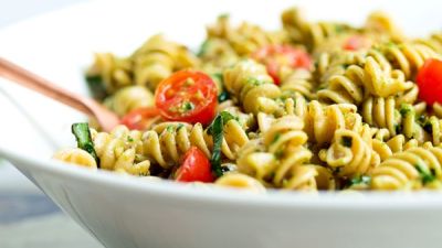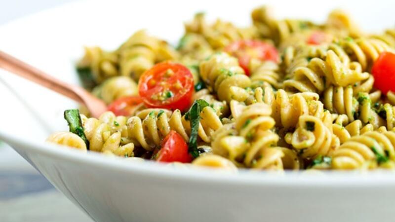 سلطة بيستو الباستا هذه سهلة، وهي من أصناف سلطة الباستا أو المعكرونة الصحية والكاملة!