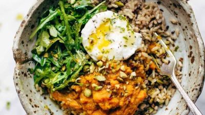 التحضير: تضاف الأوراق الخضراء وفقها القليل من الصلصة، ثم خليط البطاطا الحلوة والأرز البني والبيض المسلوق أو المقلي. واخير الصلصة وحفنة من الفستق.