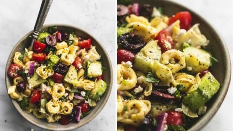 سلطة التورتيليني اليونانية السريعة والسهلة مع الصلصة اليونانية والخضروات الطازجة.