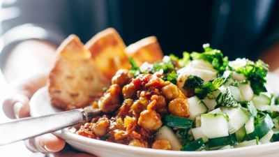 يسخن زيت الزيتون في مقلاة كبيرة على نار متوسطة. يضاف البصل المقلي حتى يصبح ليناً. يضاف الثوم والبهارات والملح والحمص - يحرك حتى تفوح رائحته. تضاف مكعبات الطماطم وتترك على نار خفيفة لمدة 20 دقيقة بينما تقوم بتحضير المكونات الأخرى.