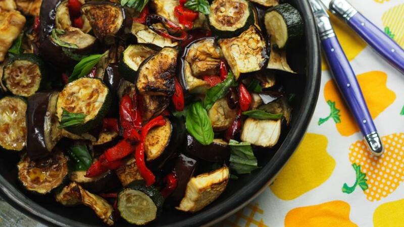 قشري الباذنجان بشكل طولي. وقطعي الكوسة حلقات.