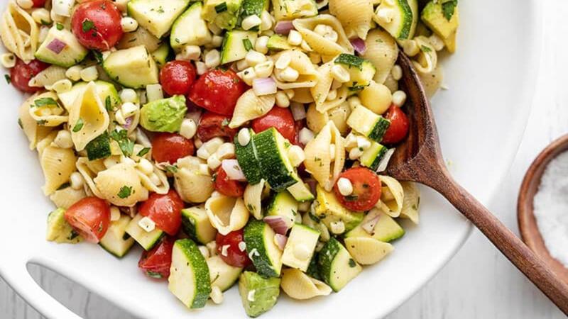 الخضار الصيفية الملونة ، الأفوكادو الكريمي ، المعكرونة ، صلصة الخل بالليمون تجعل هذه السلطة الخفيفة والصيفية حلوة وطازجة.