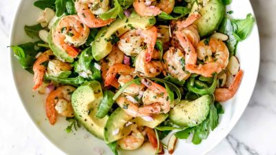 سلطة الروبيان البسيطة لذيذة جداً تجعل اي وجبة غداء أو عشاء مثالية بفضل نكهة الحمضيات، والأفوكادو الكريمية، وشرائح اللوز.