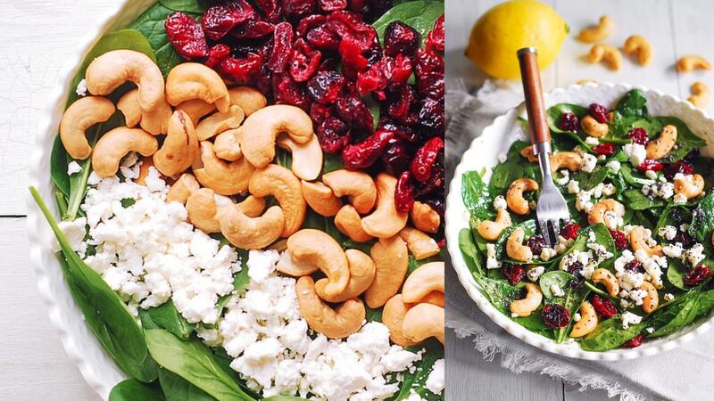 سلطة لذيذة وصحية بمكونات سهلة يحتوي على السبانخ والتوت البري مع الكاجو وجبن الماعز وصلصة بذور الخشخاش بالليمون والعسل.