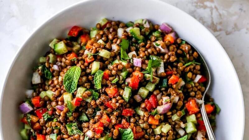 • ثم تضاف الخضار (عدا الافوكادو) إلى العدس وتخلط جيداً.