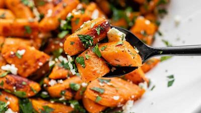 طبق جانبي بسيط غير مكلف ، يجمع هذا الطبق بين الجزر المحمص الحلو مع جبنة الفيتا المالحة والبقدونس الطازج للحصول على سلطة بسيطة.