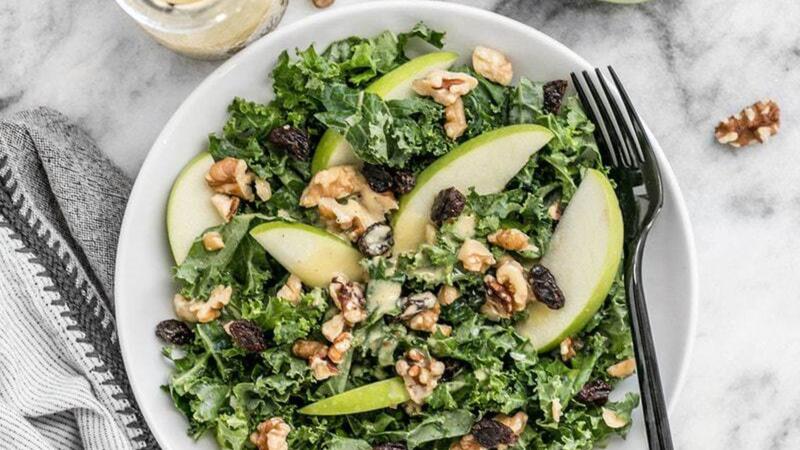 سلطة الكال بالتفاح وصلصة خردل ديجون المنعشة والحلوة والمقرمشة مع الجوز والزبيب...