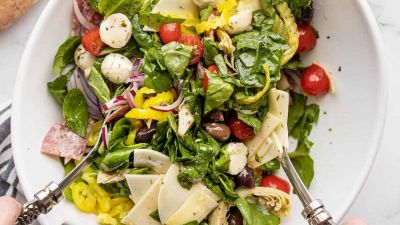 توضع الخضار في قاع الوعاء ثم توضع فوقها أصناف المقبلات. تخفق الصلصة مرة أخيرة، ثم ترش على السلطة (ابدأ بنصف الصلصة وأضف المزيد حسب الحاجة). تقلب السلطة، ثم تقدم.