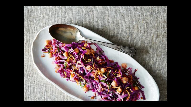تعلمي طريقة صنع سلطة الملفوف الأحمر والحمص في الجرار الزجاجية.