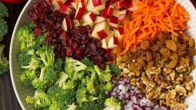 في وعاء السلطة توضع زهرات القرنبيط ، والتفاح ، والجوز ، والجزر ، والزبيب أو التوت البري والبصل الأحمر. تصب الصلصة وتقلب حتى تتغلف بشكل متساو.